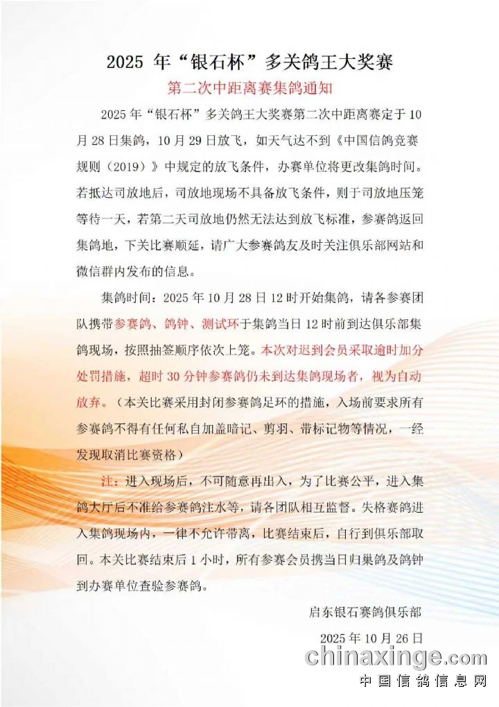 2025年"银石杯"多关鸽王大奖赛第二次中距离赛集鸽通知