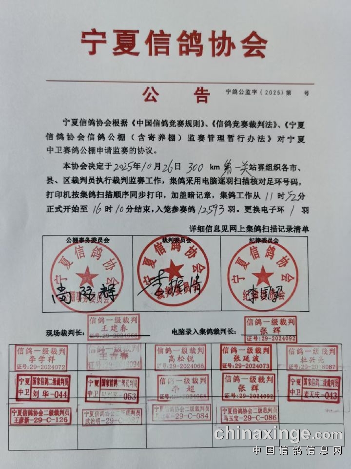• 宁夏中卫赛鸽公棚双关鸽王加站赛第一关比赛通知 (2025-11-23 9:34:14)