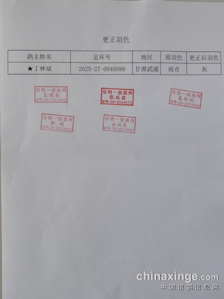 宁夏中卫赛鸽公棚300公里第一关更正羽色名单