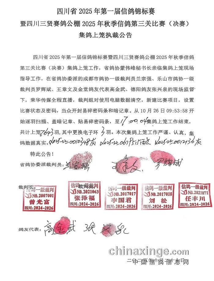 四川省2025年第一届信鸽锦标赛暨四川三贤公棚第三关(决赛)集鸽上笼执裁公告