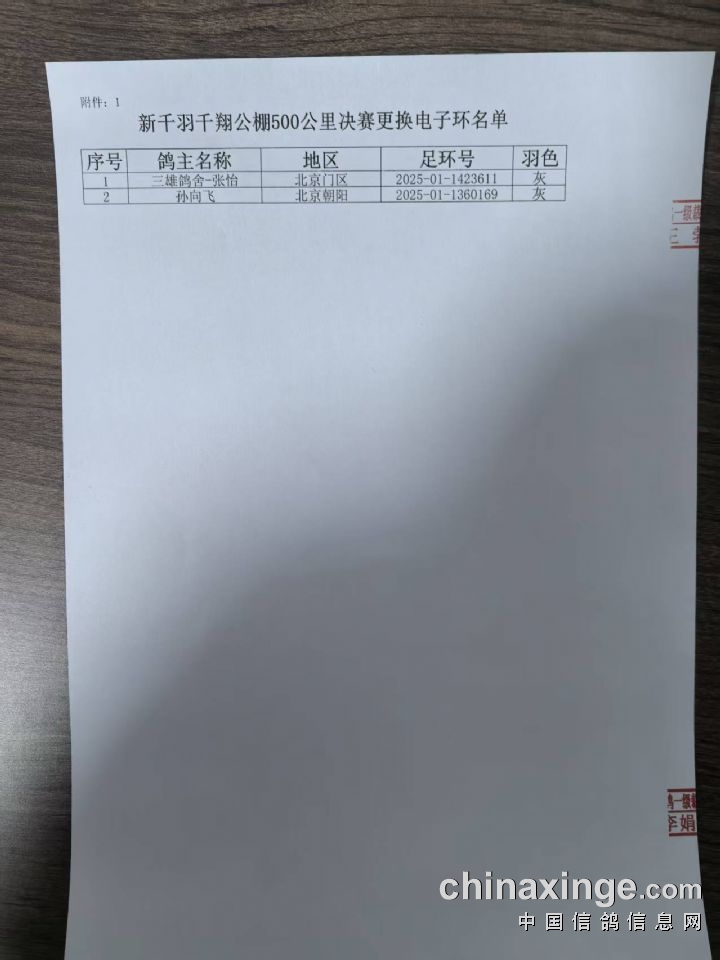 新千羽千翔公棚500公里决赛更换电子环名单