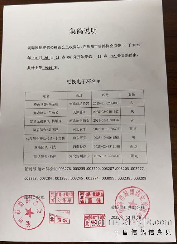 黄骅展翔赛鸽公棚100公里收费站集鸽清单