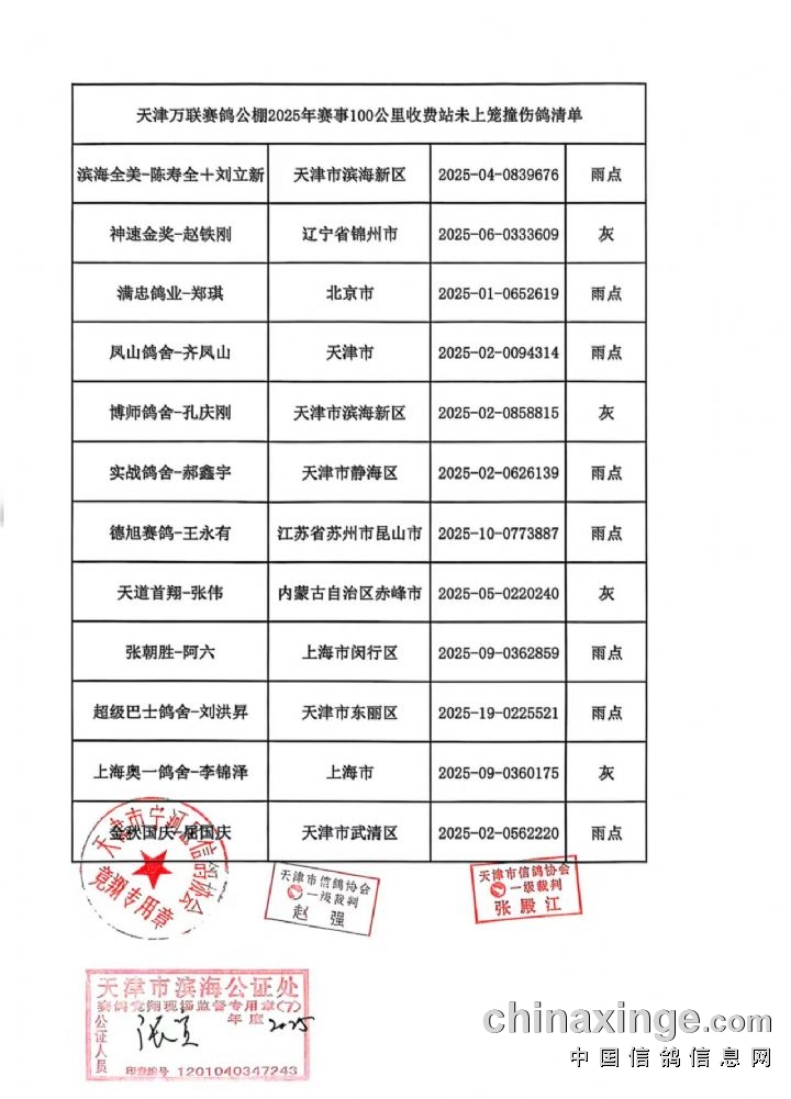 天津万联赛鸽公棚100公里收费站未上笼撞伤鸽清单