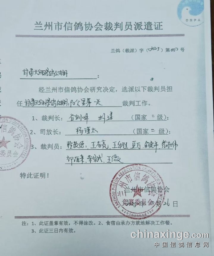 甘肃天翎赛鸽公棚191公里热身赛奖金领取通知