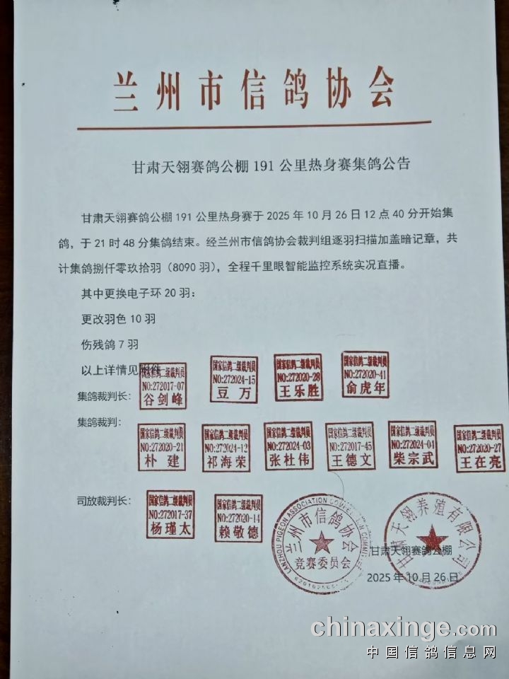 甘肃天翎赛鸽公棚191公里热身赛成绩直播