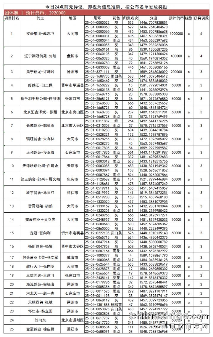 神齐国际赛鸽文化中心(公棚)团体赛获奖名单