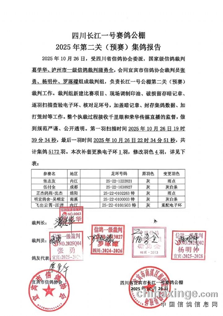 四川长江一号公棚第二关(预赛)集鸽报告