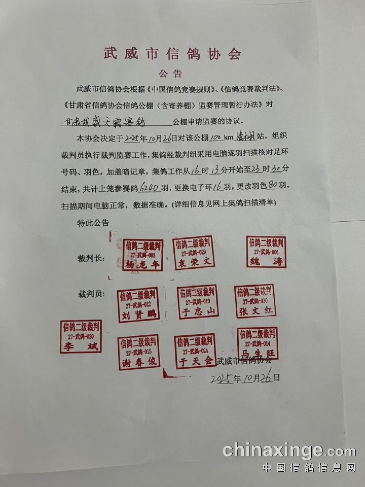 甘肃天霸赛鸽公棚100公里(清棚站)集鸽清单