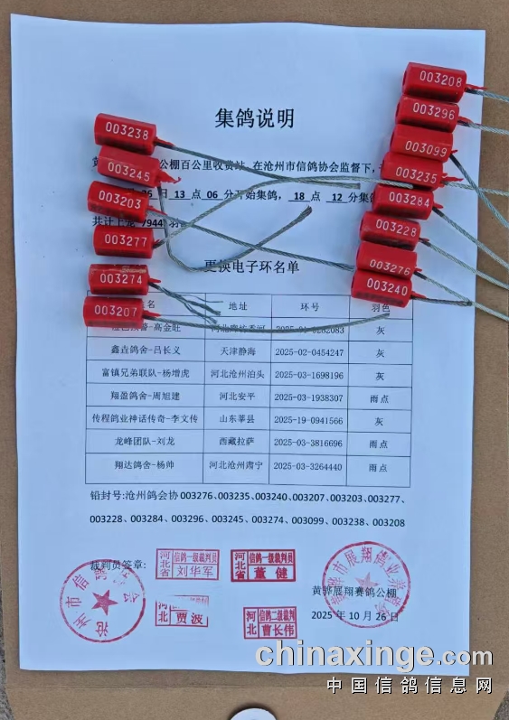 黄骅展翔赛鸽公棚100公里收费站集鸽清单
