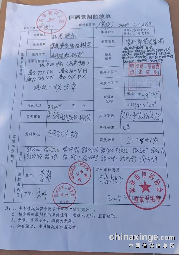 为更好体现公开透明,所有比赛届时均由监赛协会委派裁判及鸽友代表监督训放、比赛全过程。(各关比赛均由上一站次放飞排名1、11、21、31、41、51、61、71、81、91、名的鸽主组成监督团,参加各站比赛的集鸽、登检、入笼,并随车前往监督比赛开笼放飞过程,公棚负责吃住行及监督费用。)