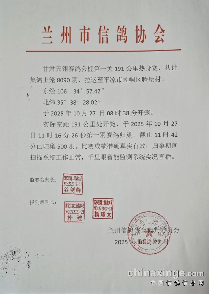 甘肃天翎赛鸽公棚191公里热身赛成绩直播