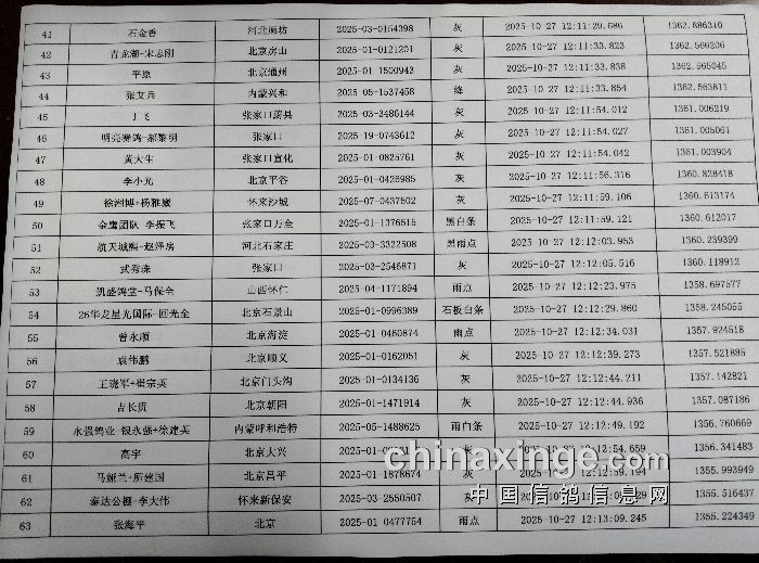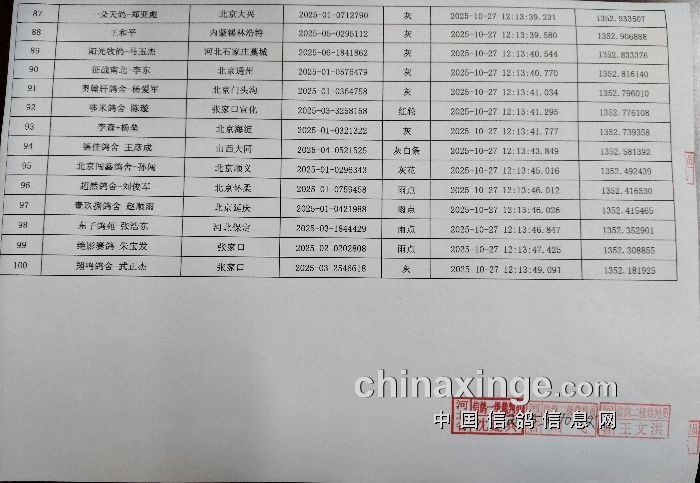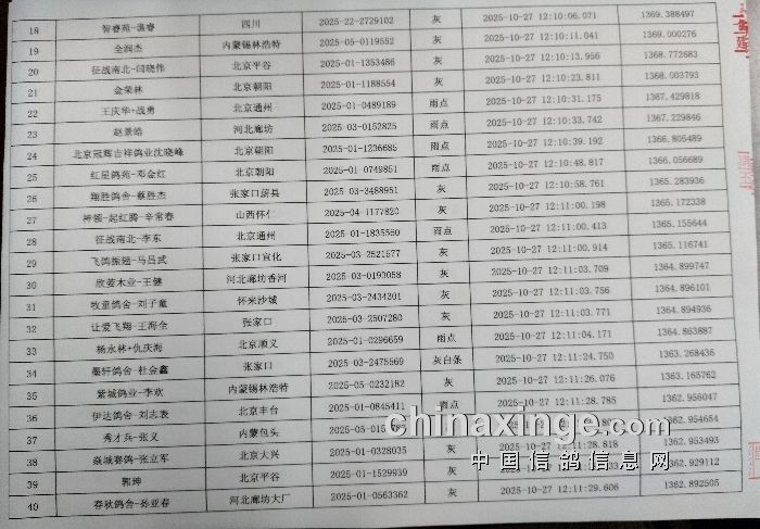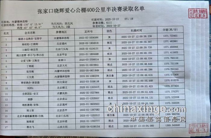 张家口晓辉爱心公棚500公里决赛三日归巢数据(按名次)