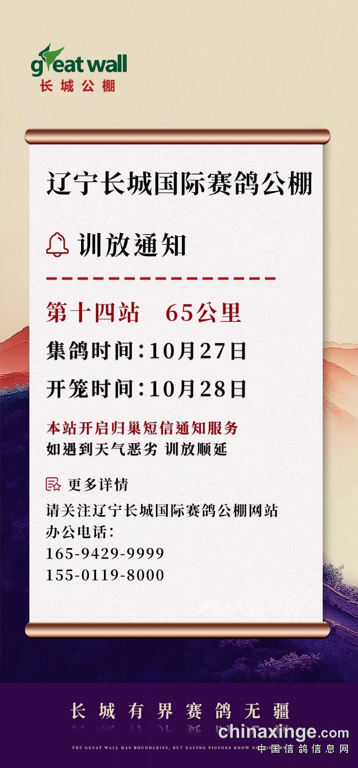 辽宁长城国际赛鸽公棚第十四站第一次65公里训放通知