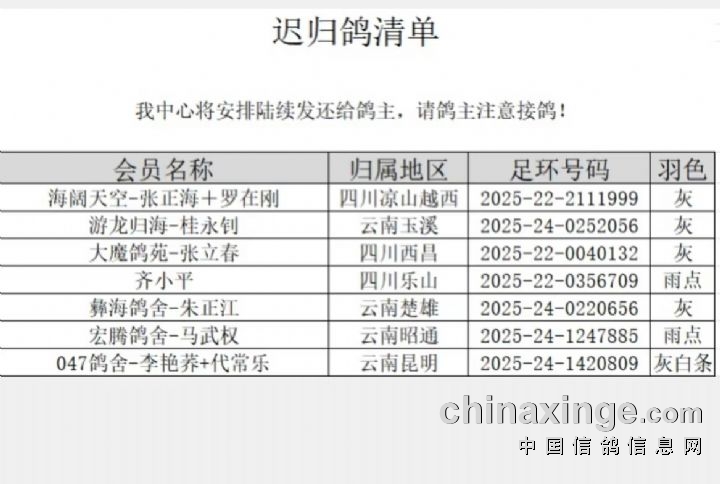 2025年天南铜都(大秋棚)第一关归巢受伤鸽清单