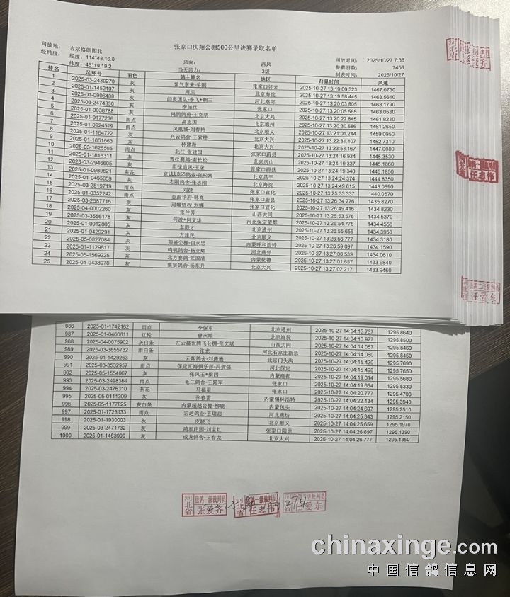 张家口庆翔公棚500公里决赛前1000名成绩有效证明
