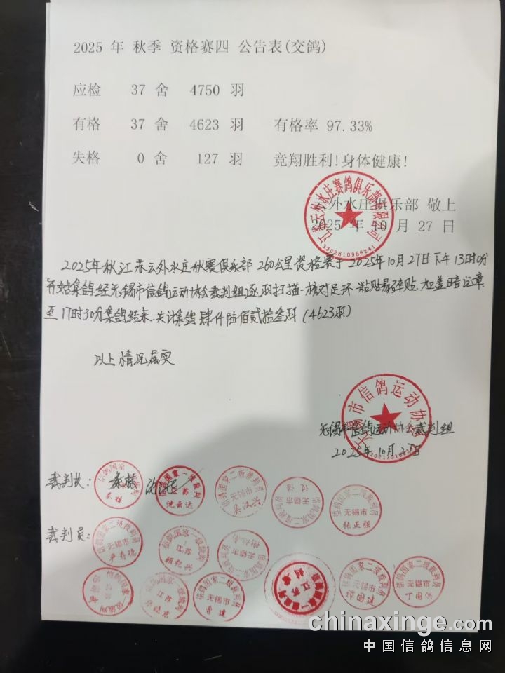 云外水庄赛鸽俱乐部第四次短距离赛于2025年10月27日下午13:00开始集鸽,经无锡市信鸽运动协会裁判组逐羽扫描核对羽色、足环并加盖暗记章于17时30分集鸽结束,共计集鸽肆仟陆佰贰拾叁羽(4623羽)。
