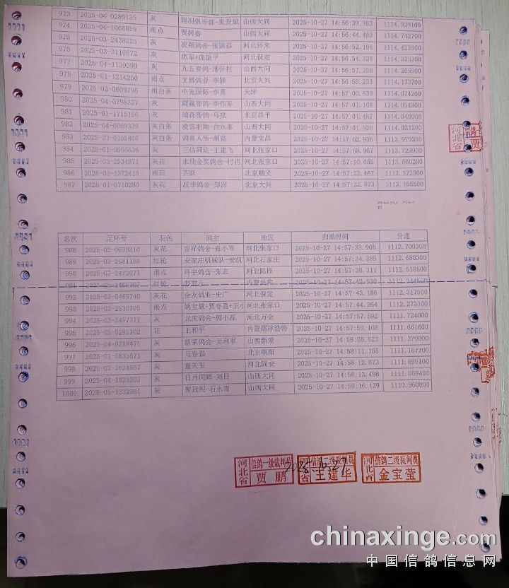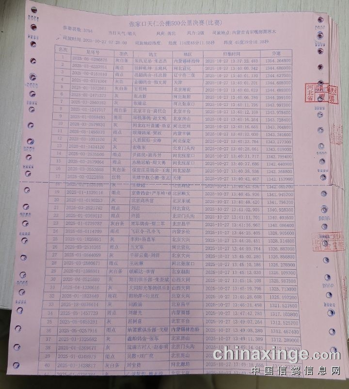 天仁公棚500公里决赛3日归巢数据(按名次)