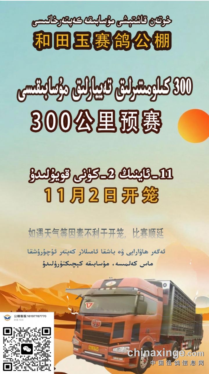 新疆和田玉赛鸽公棚300公里(预赛)将于2025年11月1日集鸽,11月2日放飞