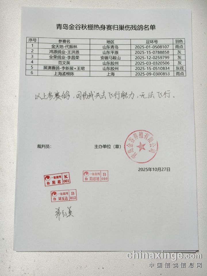 青岛金谷秋棚 第一关比赛归巢伤残鸽清单
