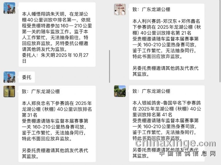 第1名21名31名41名的鸽友由于个人原因无法参与本次热身赛的监放!