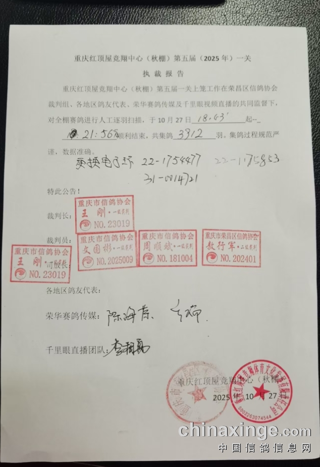 重庆红顶屋竞翔中心(秋)25年第一关比赛司放公告