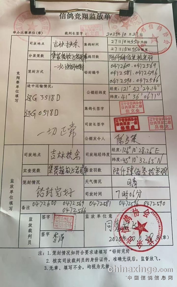 北镇金龙公棚500公里决赛于吉林扶余放飞,开笼时间:7点06分,司放地天气:晴。鸽群走势良好,归巢成绩短信实时发送。预祝参赛鸽友取得优异成绩。
