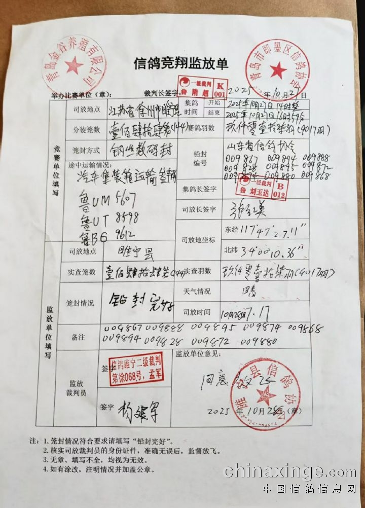 青岛金谷秋棚 第八届秋赛第一关竞翔监放单及司放照片