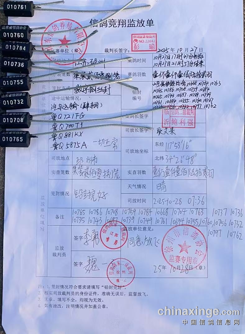 | 山东胜道公棚2025年收费站训放,实际空距:102.6公里,集鸽羽数11162羽,于2025年10月28日7点36分在江苏省邳州市开笼,司放地天气晴,赛鸽定向良好!祝君好运!