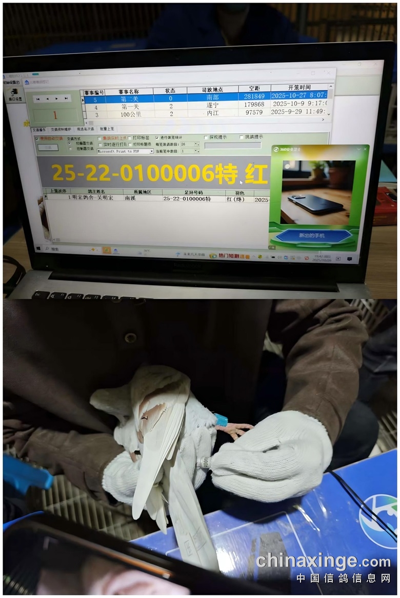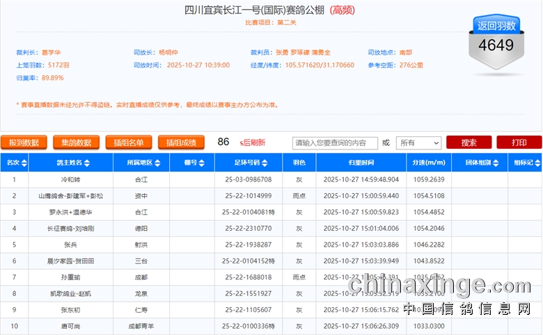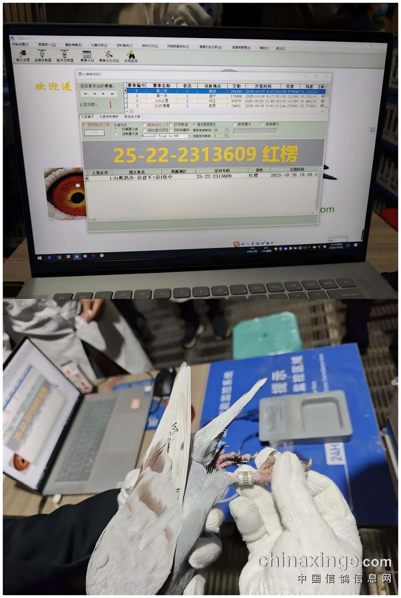 四川省宜宾市长江一号国际公棚(秋棚)2025年第十届第二关(预赛)在全国鸽友的大力支持和关怀下,受四川省信鸽协会委派,国家级信鸽裁判葛学华、泸州市一级信鸽裁判蒲勇全,会同宜宾市信鸽协会裁判员张勇、杨明仲、罗琢碟组成裁判组和鸽友代表的共同监督下,对全棚赛鸽进行人工逐羽扫描,于2025年10月26日晚19:31分左右开始集鸽,10月26日晚上22:34分结束集鸽工作,共集鸽5172羽。 赛-鸽-天-堂网对本次比赛全程进行网络直播!
