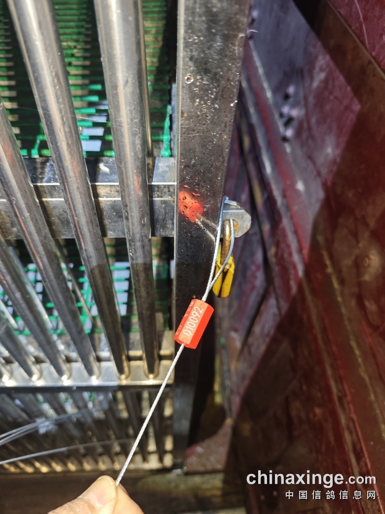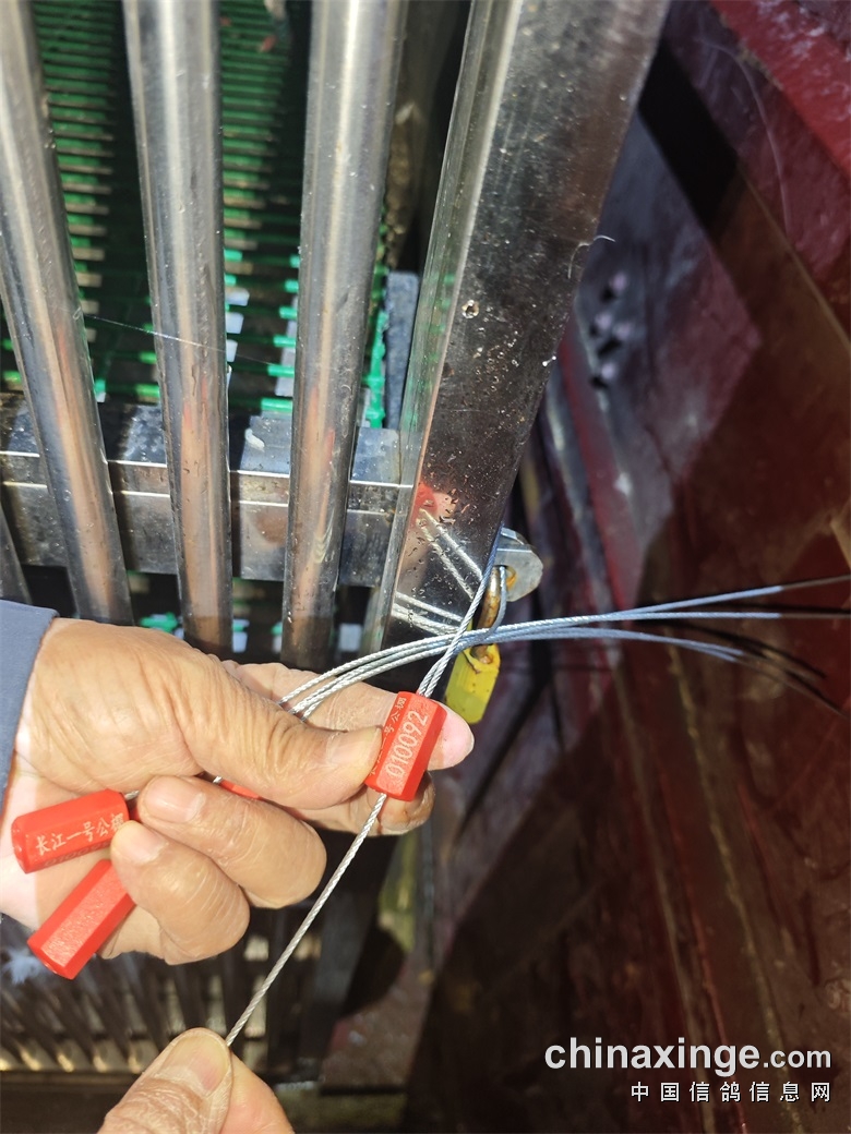 ▼裁判组查看并展示铅封完好无损后给鸽车打上铅封
