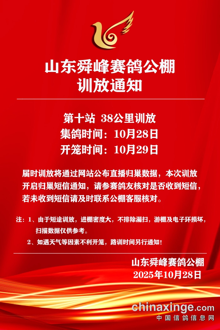 山东舜峰赛鸽公棚第十站38公里训放通知