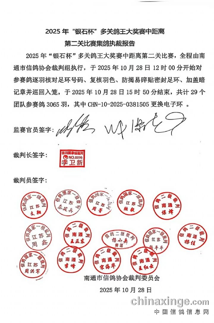 2025年“银石杯”多关鸽王大奖赛第二关中距离赛集鸽工作于10月28日12时,在江苏银石赛鸽俱乐部集鸽大厅按抽签顺序准时进行。直至15时50分集鸽工作结束,共有29舍3065羽参赛鸽上笼参赛,预祝大家取得佳绩!