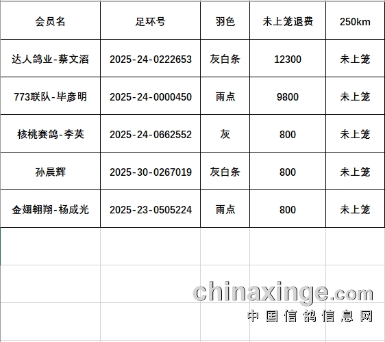 鑫翔公棚250公里第一关追加赛报名未上笼退费清单
