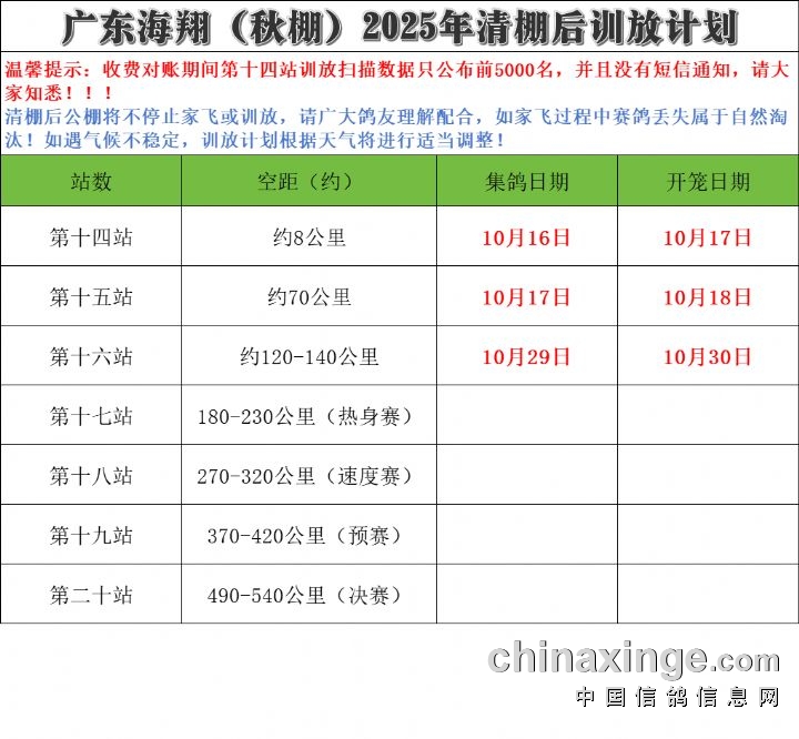 广东海翔(秋棚)第十六站120公里训放定于2025年10月29日晚集鸽,10月30日早上开笼!如遇恶劣天气,则改期另行通知!