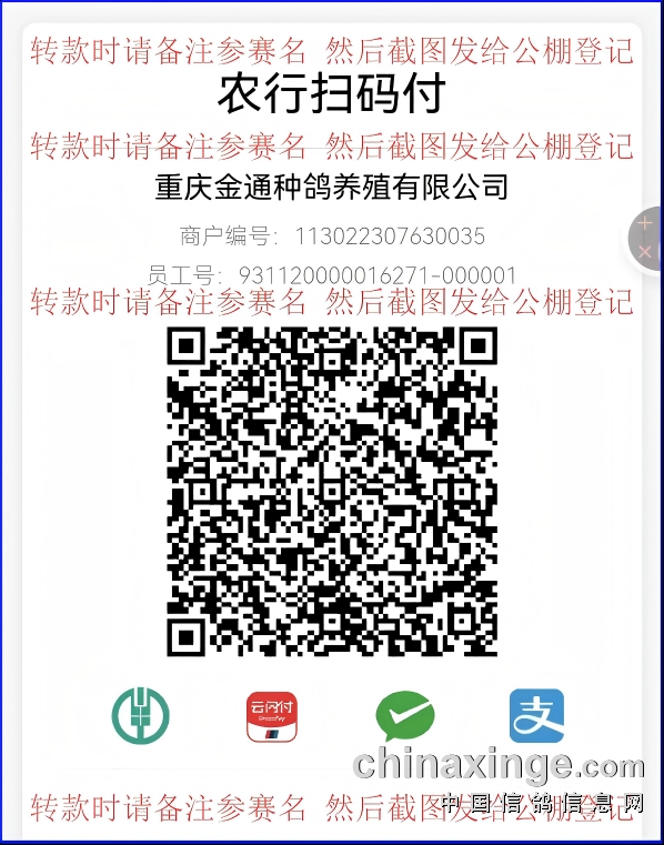 转款成功后截图发给金通指定的凭证接收员。附加短信或微信说明参赛名、环号、项目组别。注意:银行汇款时请选择实时到账。本中心根据参赛费实时到账时间登记交费记录。因24小时到账而延误参赛时机的鸽主,责任自负。