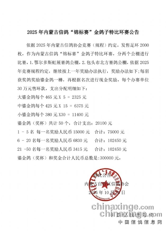 2025年内蒙古信鸽“锦标赛”金鸽子特比环赛公告
