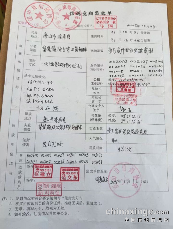 200公里资格赛于10月31日集鸽、11月1日开笼,200公里将进行人工逐羽唱号扫描、加盖暗章、随机打印,并由绥中县信鸽协会裁判组亲临现场监督此次集鸽、装笼、开笼、归巢全过程,同时我们将委托媒体对此次训放进行全程网络视频直播,并开启归巢短信通知服务。