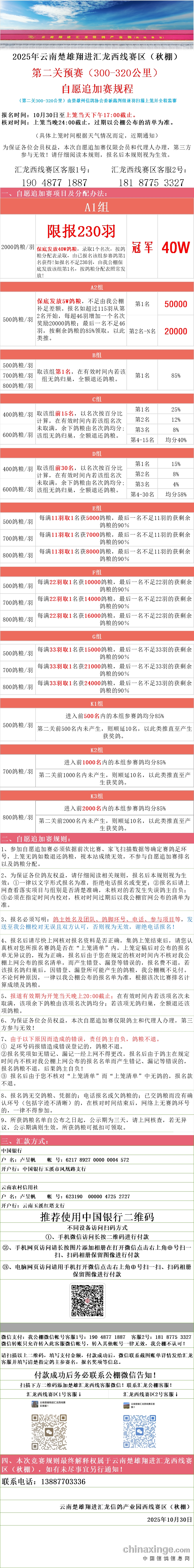 汇龙西线赛区:第一关230公里自愿追加赛未上笼报名鸽