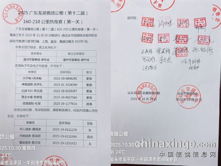 广东龙湖赛鸽公棚(第十二届)160-210公里热身赛(第一关)集鸽工作于2025年10月29日晚进行,由汕头市信鸽协会裁判组及鸽友代表进行逐羽扫描、上笼、监放,集鸽总数为10205羽。