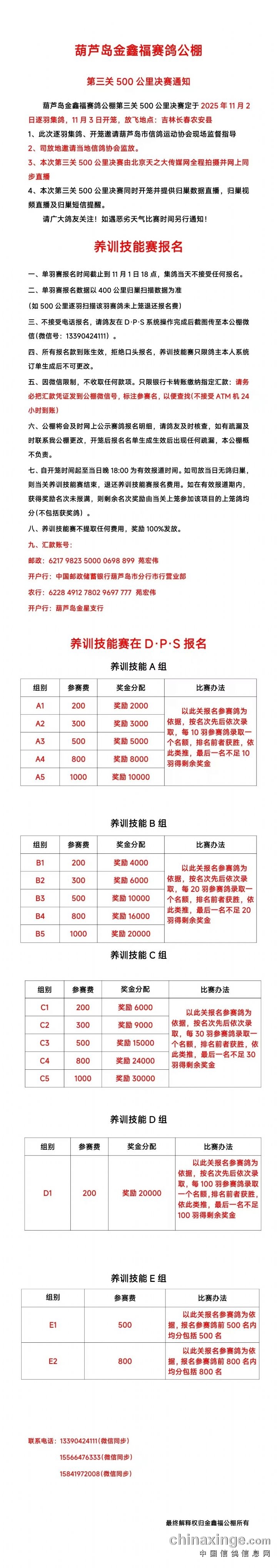 葫芦岛金鑫福赛鸽公棚第三关500公里决赛比赛及养训技能赛公告