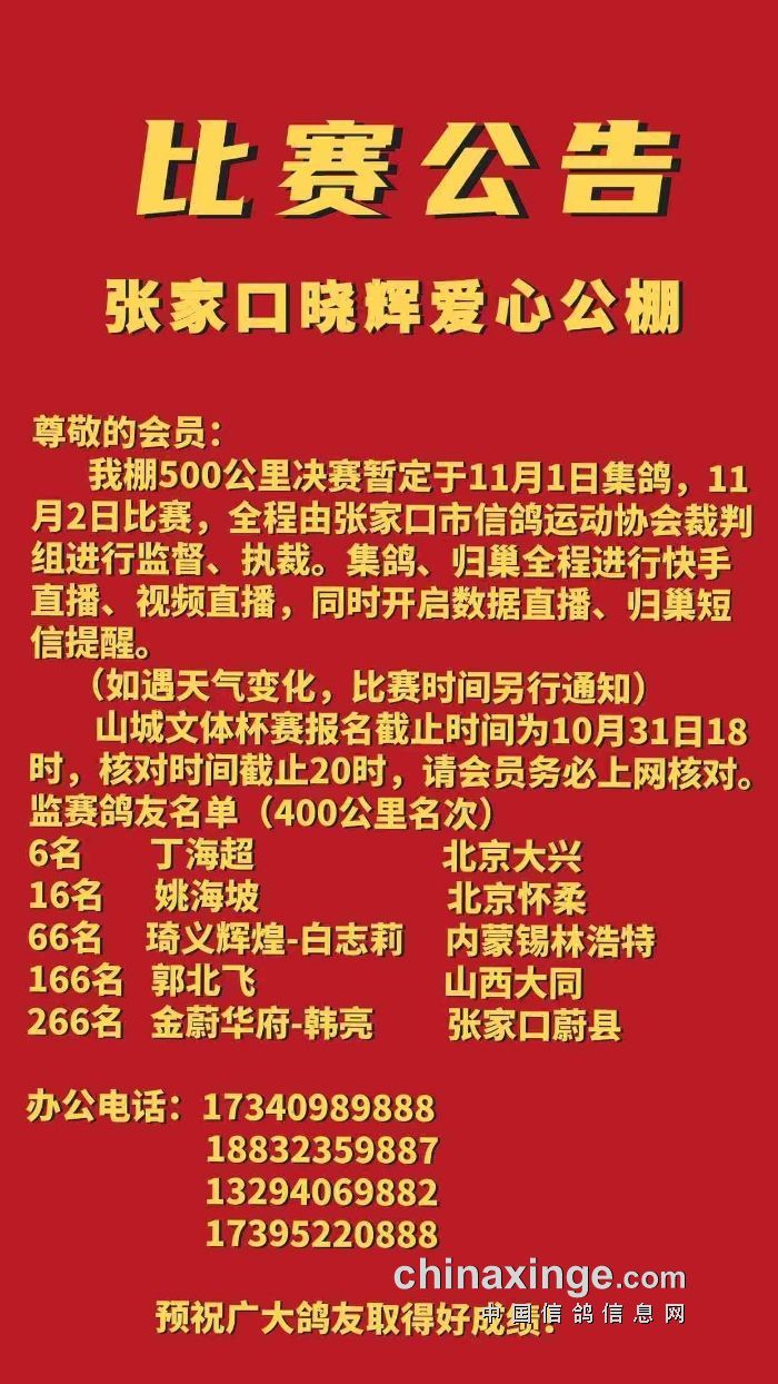 张家口晓辉爱心公棚500公里决赛三关、双关鸽王获奖名单