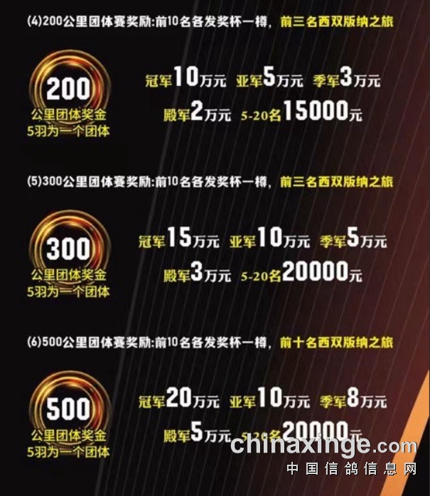 团体赛同一参赛会员交鸽满5羽为一个团体,具备团体赛资格:多交(5的倍数) 可分a、b、c.....组,以此类推。团体赛以200.300.500公里各关名次有效取奖羽数多者为胜。如获奖羽数相同,按第一羽获奖名次先后排名。200.300.500.公里团体赛全部以90-100公里收费站归巢三日内数据一次性确定环号,一经确定环不可更改,各关丢失死亡按自然淘汰。不在同一名下的不得互换或并组。如分组确定期限内参赛会员未分组,则本公棚以电脑自动排序分组为准