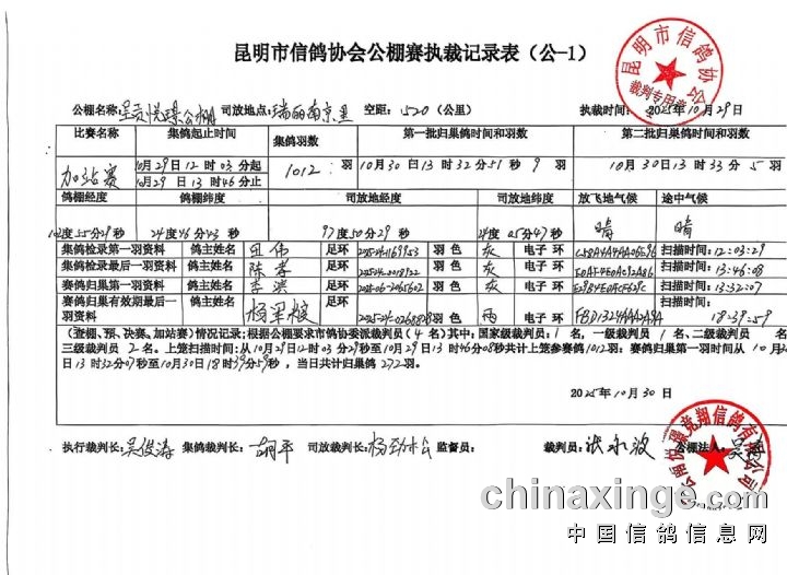 云南悦璟赛鸽中心“520公里”加站赛归巢数据汇总