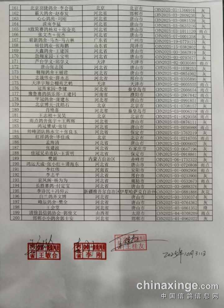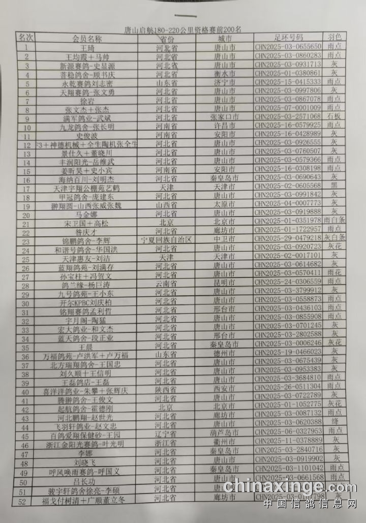 唐山启航公棚>180-220公里资格赛前200名获奖鸽名单