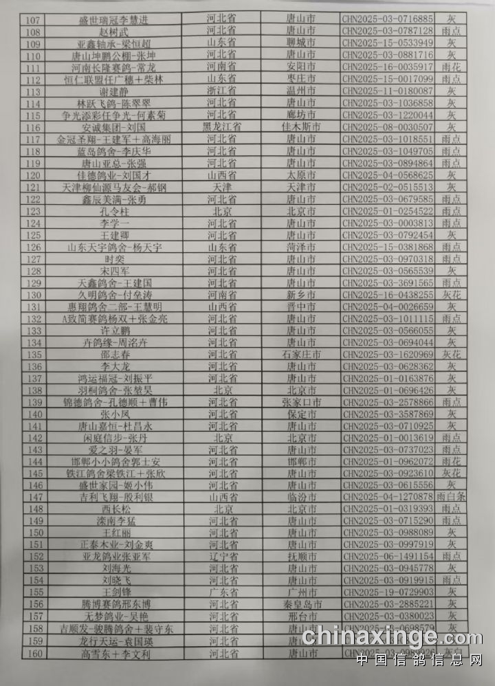 唐山启航公棚>180-220公里资格赛集鸽清单
