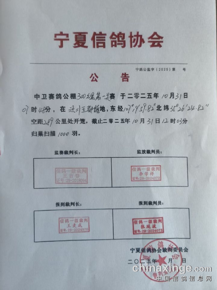 宁夏中卫赛鸽公棚300公里第一关奖金领取通知