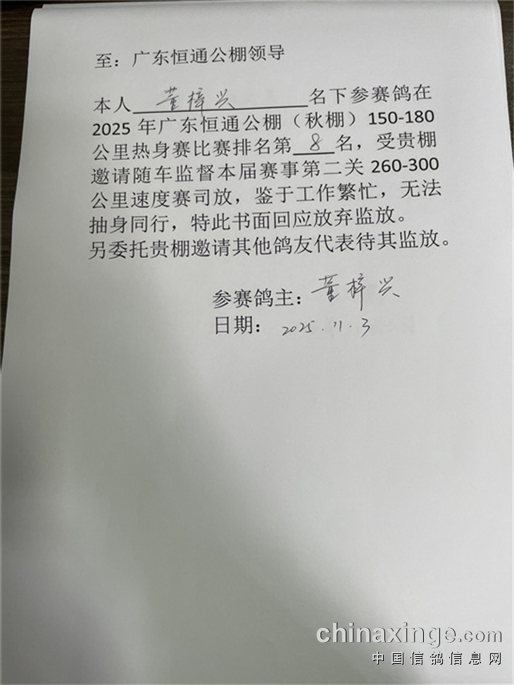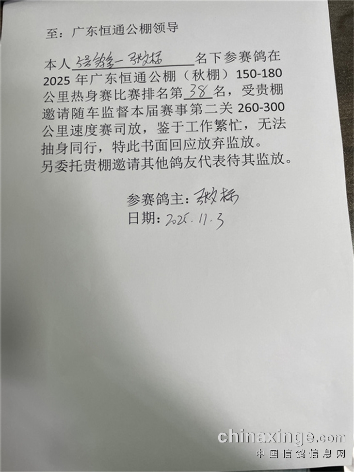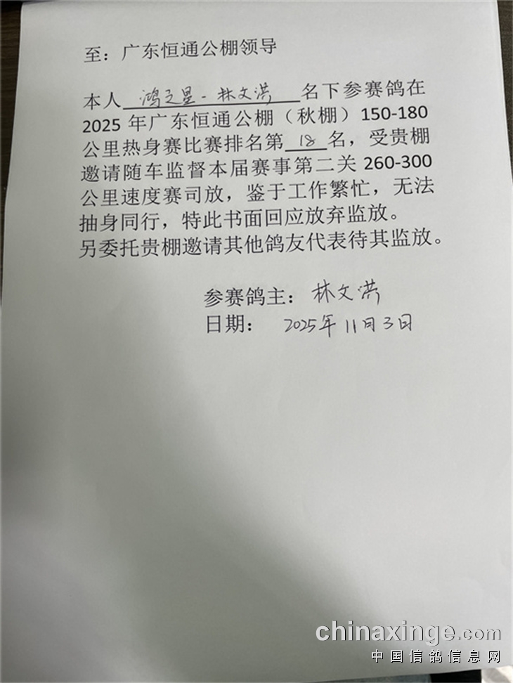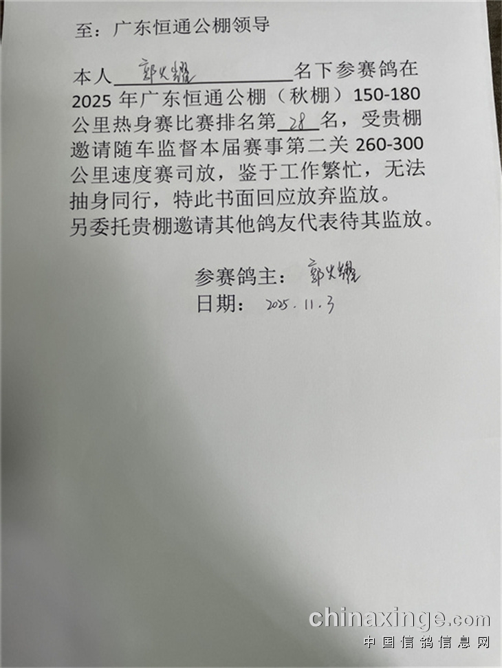 2025年 广东恒通(秋棚)第十五届第二关260-300公里速度赛定于11月4日下午集鸽,11月5日早上开笼;司放地点:福建境内;届时由广东省信鸽协会委派裁判长及潮州市信鸽协会裁判组进行逐羽扫描、核对环号、盖章、(邀请福建省信鸽协会现场监放)等工作;(如遇恶劣天气,则改期另行通知!)