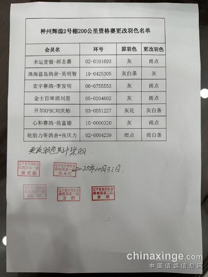 神州辉煌2号棚200公里资格赛更改羽色名单