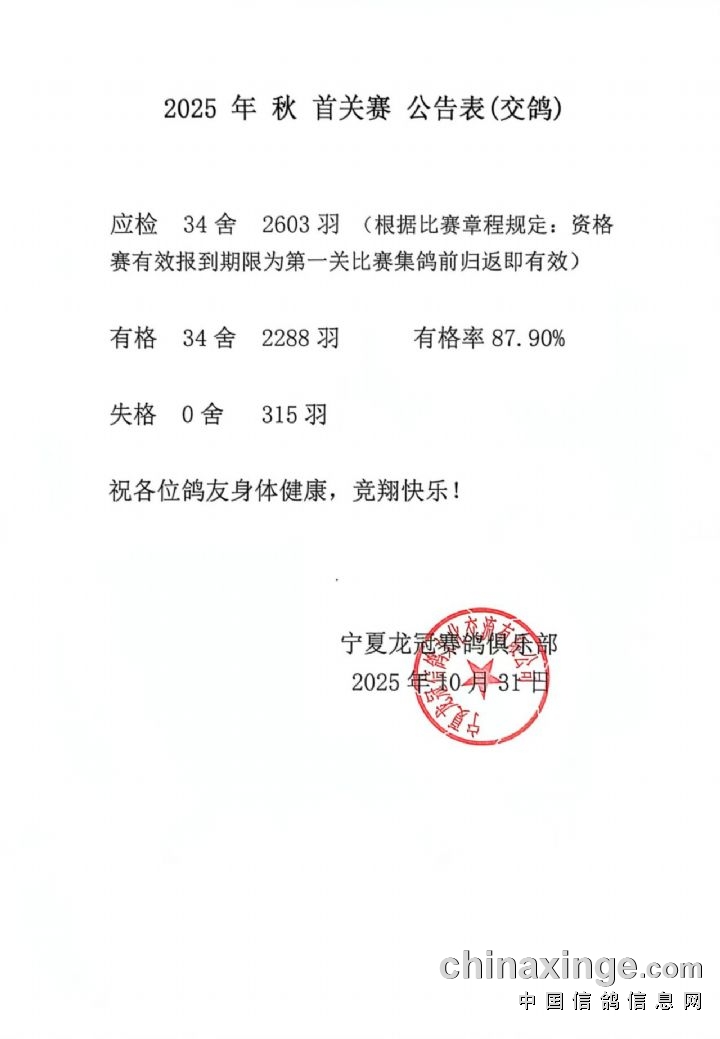 宁夏龙冠赛鸽俱乐部首关交鸽公告