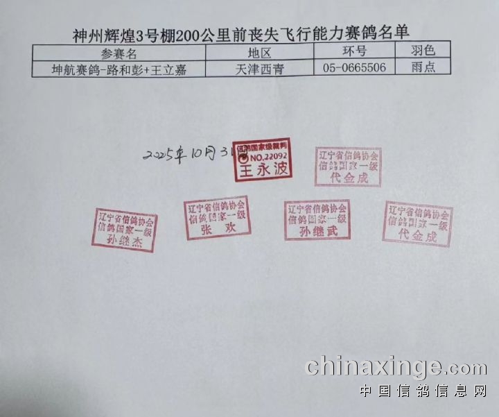 神州辉煌3号棚200公里资格赛更改羽色名单